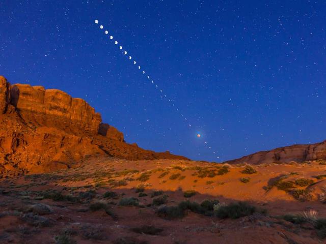 2015年4月4日摄于Tear Drop Arch附近的月全食,犹他州纪念碑谷 (© Alan Dyer/Alamy)