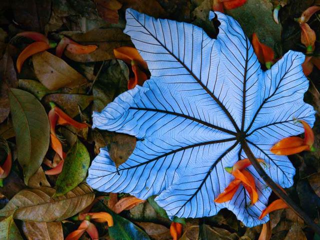 一片飘落在龙虾爪瓣上的号角树树叶,墨西哥 (© Gerry Ellis/Minden Pictures)